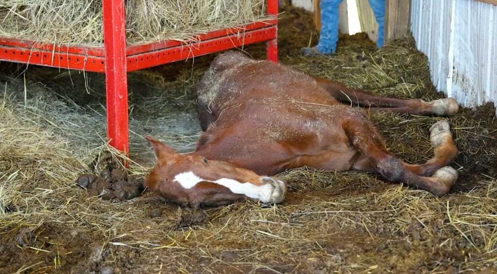 The team faced a tense and frightening moment when they discovered Cinder wedged between a hay feeder and a wall, a dangerous situation known as being “cast.” She had likely been struggling for hours, leaving her dehydrated, exhausted and at risk for serious complications.