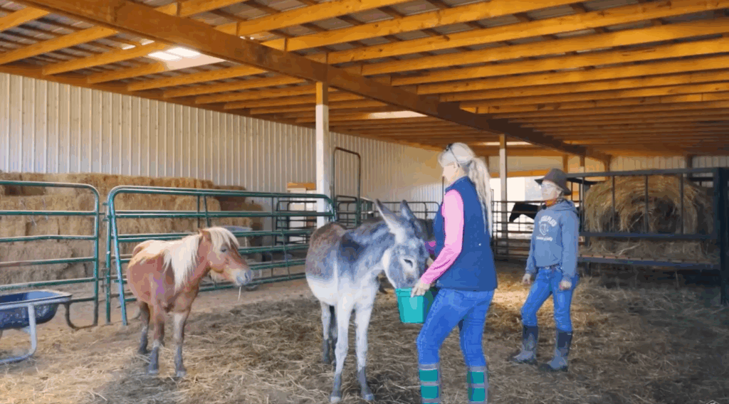 Behind the scenes, rehabilitation is in full swing. Young horses navigate obstacles as part of their training, unhandled mules learn to trust through calm and consistent cues, and farrier and veterinary teams work together to treat abscesses, manage vaccines and support recovery.
