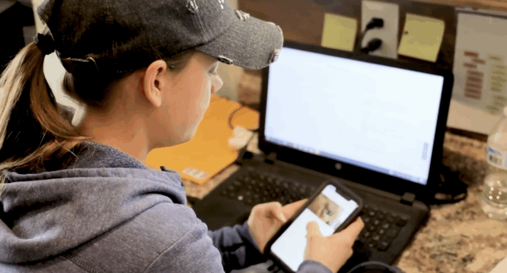 While the tech work happens indoors, the barn team works outside cleaning and grooming horses, getting them ready for new photos and adoption listings.