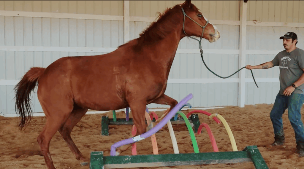 Rose takes on an obstacle course designed to build confidence around unfamiliar sights, sounds, and surfaces. This type of desensitization training helps horses become safer, calmer, and more adoptable, especially for trail riding homes.