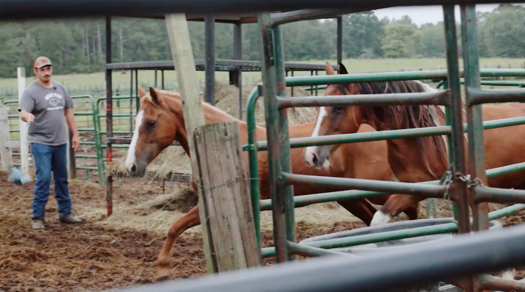 The episode begins with hands-on work with recently arrived horses, including Mustangs transferred from a rescue in Florida. Some are wary, unhandled and unsure of people.
