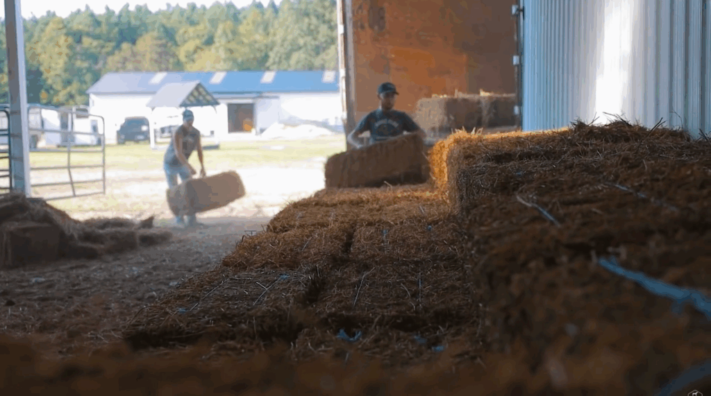 Staff, volunteers, and even Caleb from behind the camera grab pitchforks and get to work. What was estimated as a small job turns into moving around 250 bales of hay. It is hard work, lots of laughs, and a true team effort that keeps the shelter running.