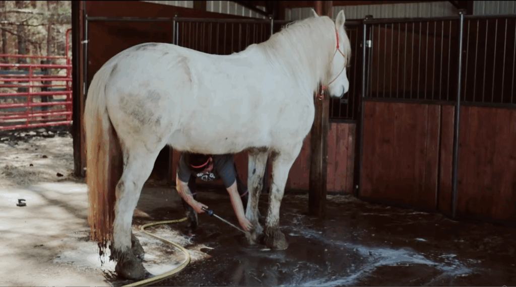 Even bath time doubles as assessment time, as seen with Mr. Hawaii, a stallion with a challenging history who is given extra care and safety planning every step of the way.