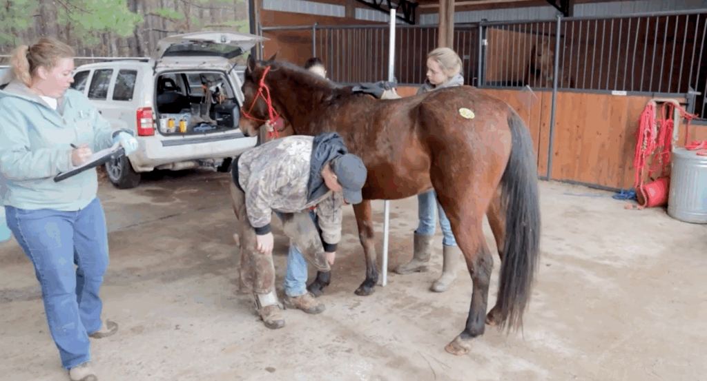 After a few hours of rest, the team was back at sunrise for the initial intake process. One by one, each horse received an ID tag, photos, and a medical evaluation. Some had lameness issues, others were severely underweight or had hoof problems from neglect. The veterinarians and farriers worked tirelessly to assess injuries and start treatments.
