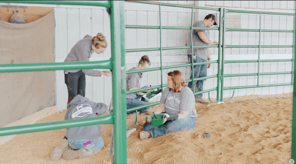 The day begins with improving the round pen, carefully measuring, expanding and painting it bright green. These upgrades are not just about looks. A safe, well designed space is critical for training, filming, and helping horses gain confidence as they prepare for adoption.