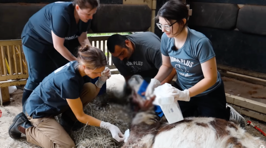 Our adorable donkey, Pooh, underwent an hour-long surgery to remove four large masses, including a baseball-sized one on his throat. He handled anesthesia like a pro and is currently waking up and healing.