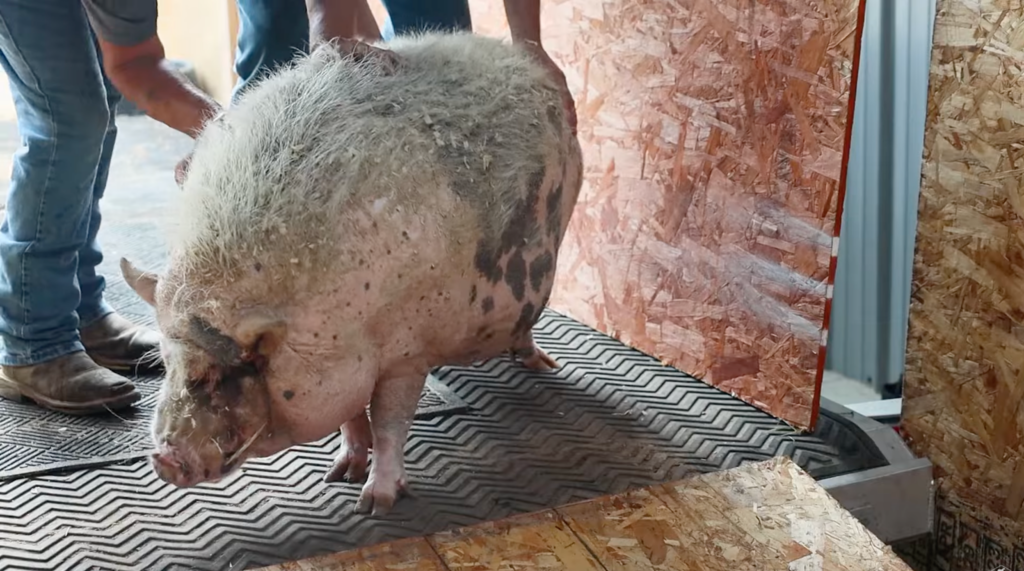 Getting a pig off a trailer is always an adventure, but the pig’s settling in nicely with some fresh mud puddles to keep them cool (since pigs don’t have sweat glands!).